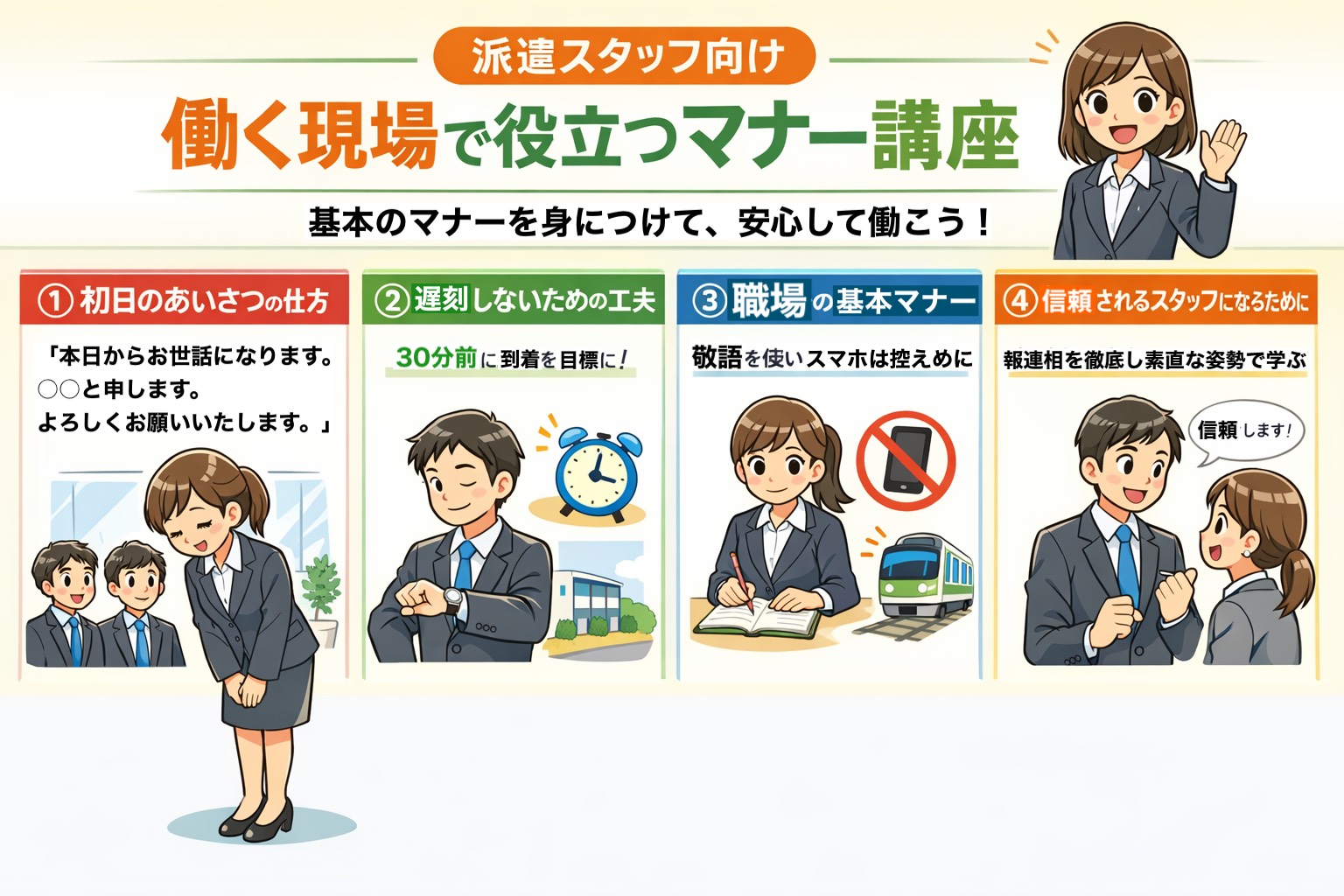 派遣先企業で信頼されるスタッフとして活躍するためには、業務スキルだけでなく基本的なビジネスマナーも重要です。